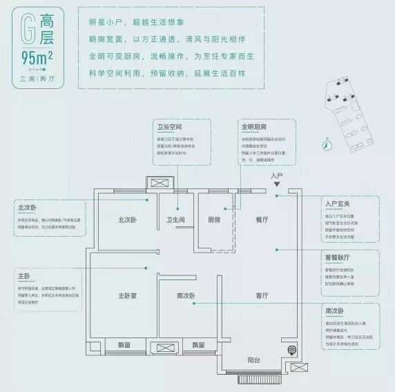 学林雅苑高层三房两厅一厨一卫建面约95平米户型,该户型和上面的90平米户型差不多格局。卫生间可采用了干湿分离的设计,洗浴与洗漱分离,日常起居更为便捷;卫生间的位置靠近主卧和次卧,起居很是方便;餐客一体,接连U型厨房格局,使得厨房操作面大、动线短、占地面积少;客厅连接观景阳台,采光好,同时使得两者空间相互扩展,更显宽大,双卧朝南带飘窗设计,增加了使用面积,阳光美景入室,极目远望看云卷云舒,听风吹雨落。