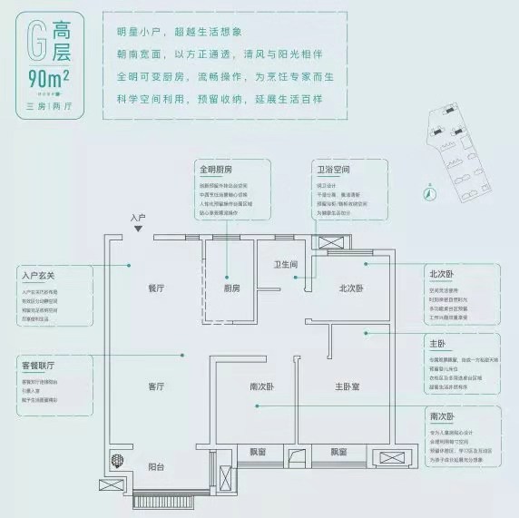学林雅苑高层三房两厅一厨一卫建面约90平米户型,客厅朝南,双卧朝南,是很受欢迎的三开间朝南设计;户型方正,南北通透,全明空间,布局合理,动静分区清晰;餐厅、客厅以及观景阳台连成一体,让每一寸空间都充满阳光、清风与美景;南向次卧和北向次卧根据家庭需求做父母房、儿童房、书房,能很好的满足普通家庭的需求。