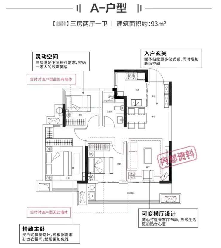 项目主要户型为88-118平方米的三至四房,主打刚需市场。其中93平方米的三房户型设计合理,南向采光充足,客厅和次卧阳台连通,主卧还留有衣帽间位置,提高了居住舒适度。而118平方米的四房户型则能满足多孩家庭的需求,尤其对于有孩子的家庭来说,空间布局更为合理。