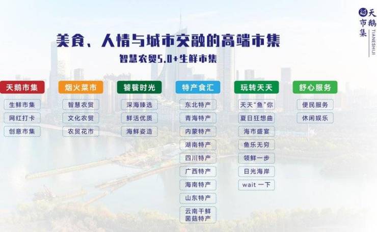 市集内业态规划包括豆制品、水果、蔬菜、快捷菜、日杂、干货粮油、机面、炒货、冷冻、酱菜/水发、熟食、腌腊、牛羊肉、肉类、光禽、海鲜、冰鲜等。同时,特设全国各地特产街区板块,成为特色文化节的首选之地。市集的全品类业态规划,将为市民带来长期繁荣。