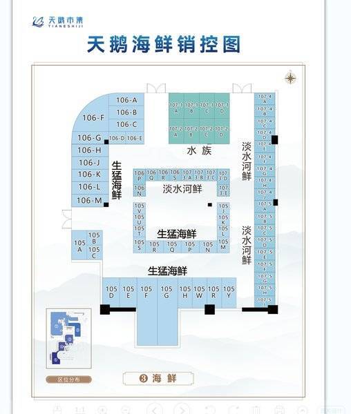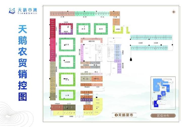 天鹅市集总面积达3800平方米,拥有2200平高端生鲜农贸、600平全国直供特产区和1200平高奢海鲜工坊。市场共有近800套房源,分为摊位和门面两种,由专业运营公司统一管理。市场以7大主题和4大科技互动装置为特色,打造出独具风采的政务区农贸集市。