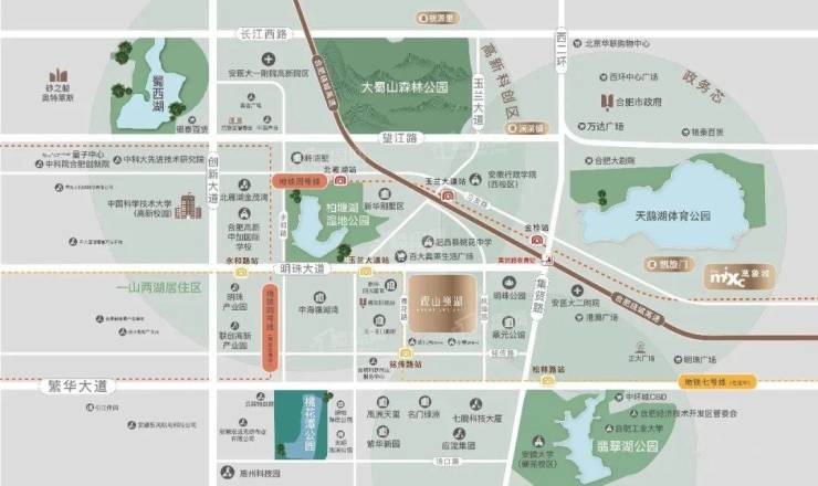 观山嶺湖项目处于政务西、高新南的发展节点之上,又位于政务、高新、经开三区黄金交汇处,出则繁华、入则宁静,尽享“合肥一刻钟生活圈”模式。