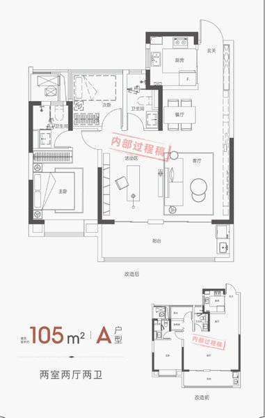 105平方米的两室两厅两卫户型方正,布局紧凑,动静分离,功能分区明确。主卧套房设计,有独立卫浴,私密性较高。客厅与餐厅相对独立又完美相融,通风式厨房设计让烹饪更加随心所欲。整体设计简约大方,给人以舒适的居住感受。