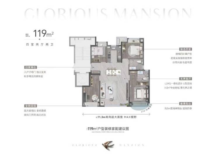119㎡的户型是经典的四叶草户型,加上飘窗赠送后,整体空间得房率近乎90%。主卧套房约20㎡,设有双衣帽柜,客厅则是一个开间5米、面积高达约40㎡的大方厅。这种户型设计不仅让居住者享受到了充足的私密空间,同时也保留了足够的共享空间,让整个家庭都能够得到舒适的居住体验。