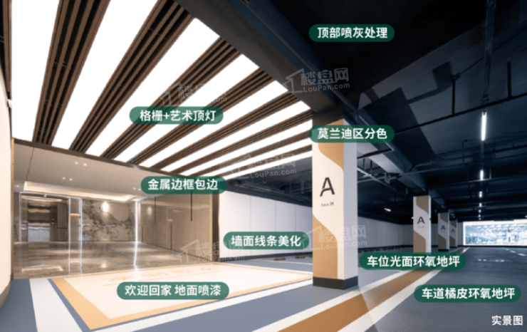 高颜值车库,驾享式归家体验。入位归家美学,选用蓝眼睛石材、艺术化顶灯、铝合金格栅等材质,感受归家的温暖与指引。