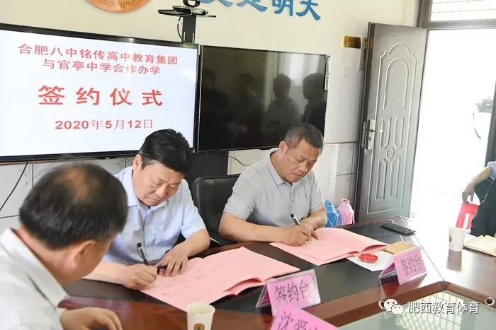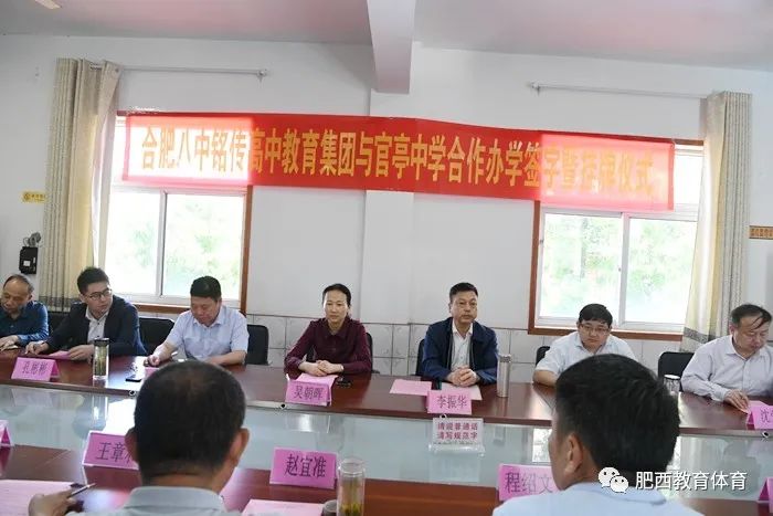 5月12日上午,合肥八中铭传高中教育集团与官亭中学合作办学签字暨揭牌仪式在官亭中学举行,副县长吴朝晖,县教体局党委书记、局长肥西师范学校校长李振华,党委委员姚中华,合肥八中铭传高中校长李勇,官亭中学校长程绍文及教体局相关科室负责人,官亭中心校、附近村居代表、官亭中学教师代表等三十多人参加签字暨揭牌仪式。