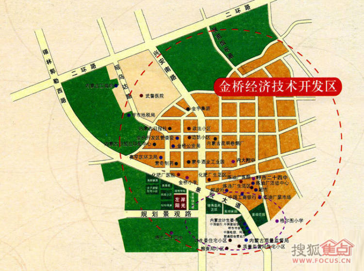 学校:金起点、双语幼儿园、呼市二十四中、明德学校、内蒙古箭埠专修学校、17中,金桥小学,内大附中(规划中)