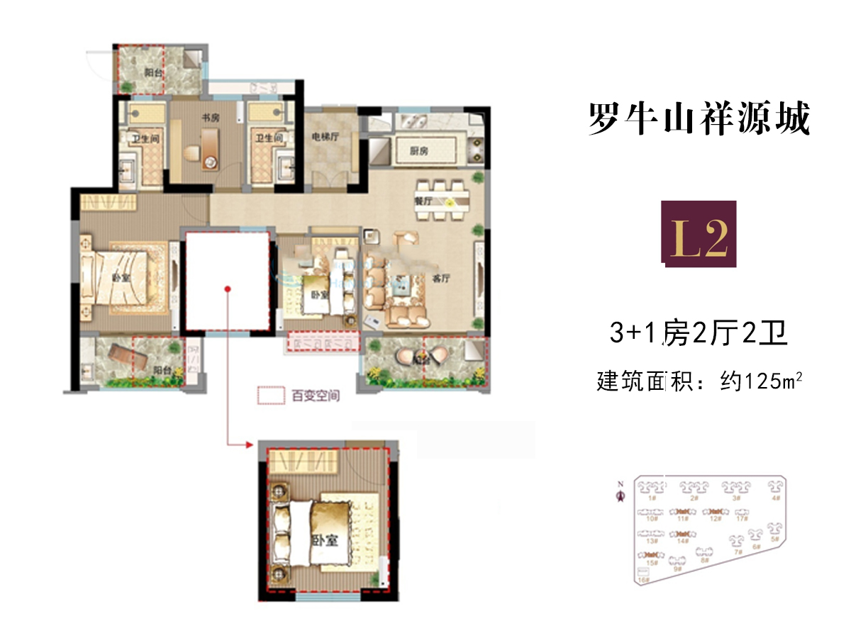 4室2厅2卫-L2户型 建筑面积约125平 四房两厅