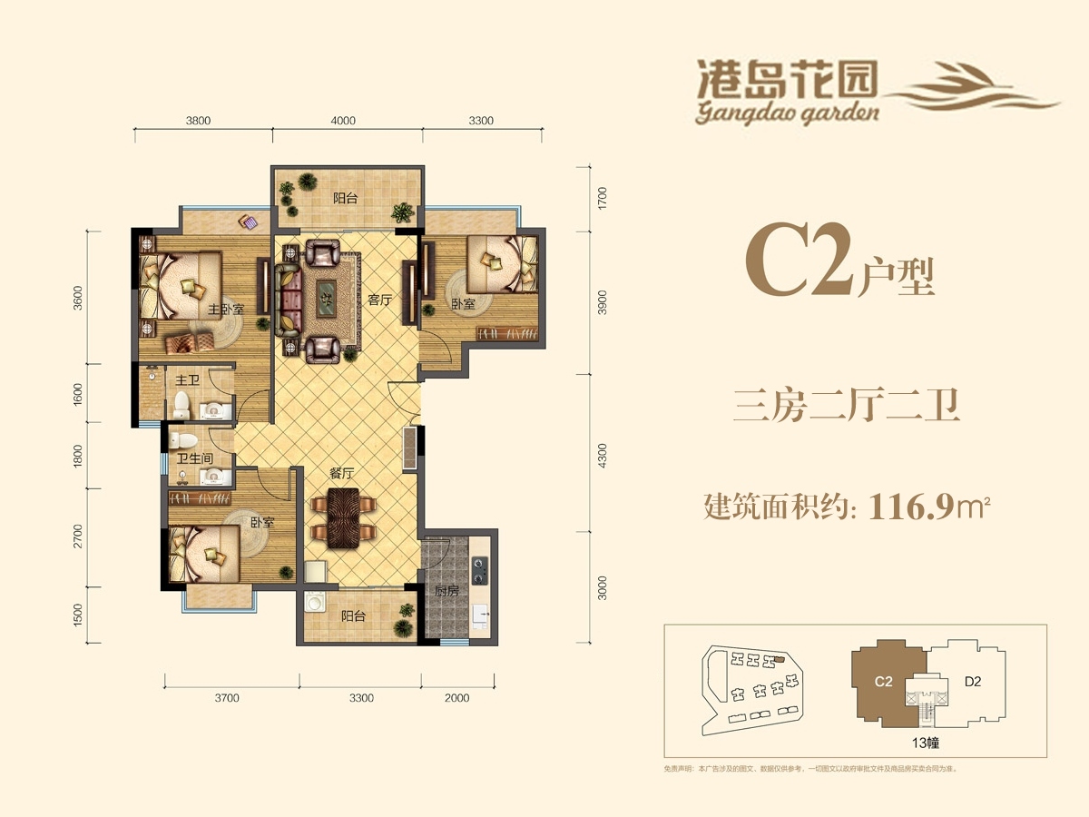 3室2厅2卫-C2户型建面约116.9㎡三房两厅两卫