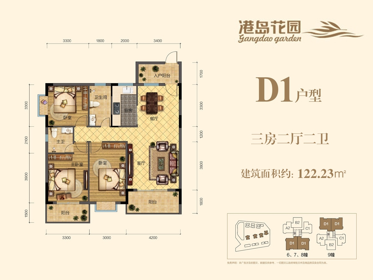 3室2厅2卫-D1户型建面约122.23㎡三房两厅两卫