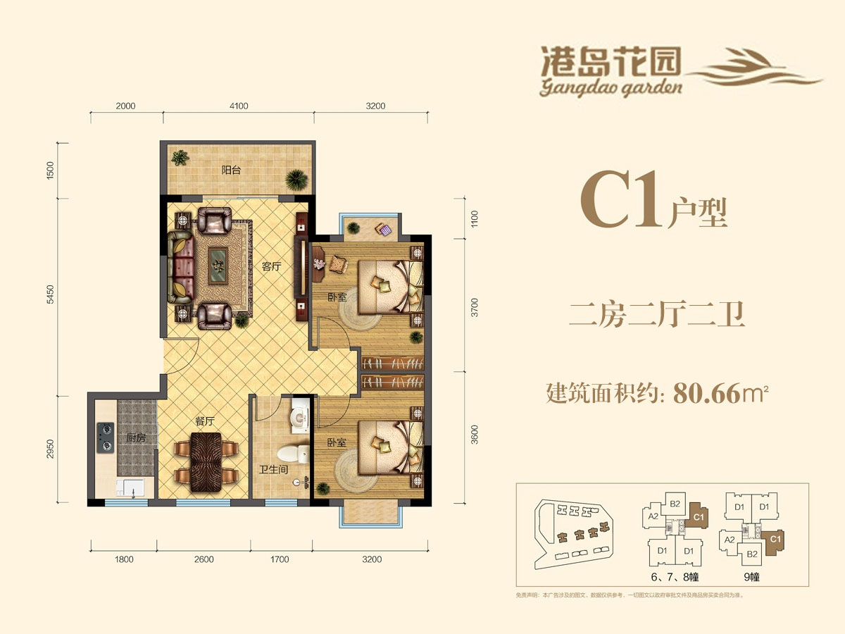 2室2厅2卫-C1户型建面约80.66㎡两房两厅两卫