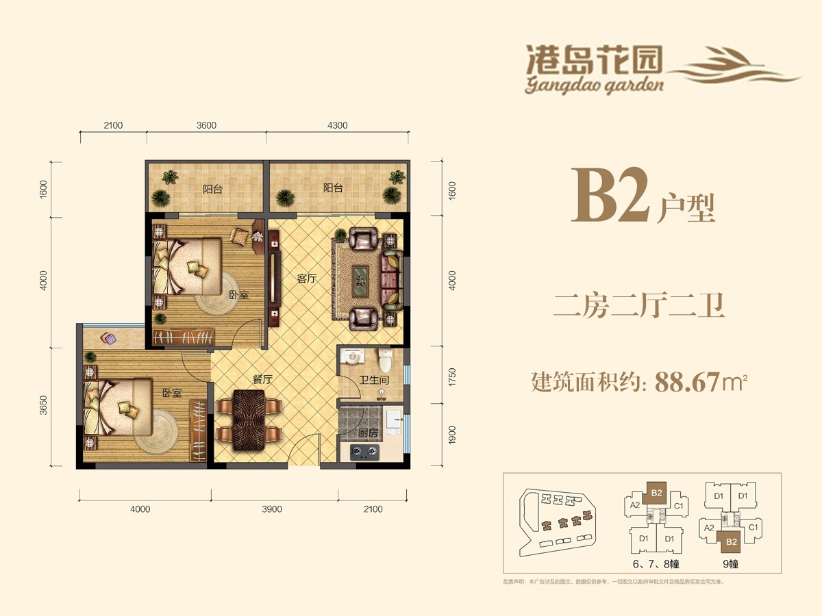 2室2厅2卫-B2户型建面约88.67㎡两房两厅两卫