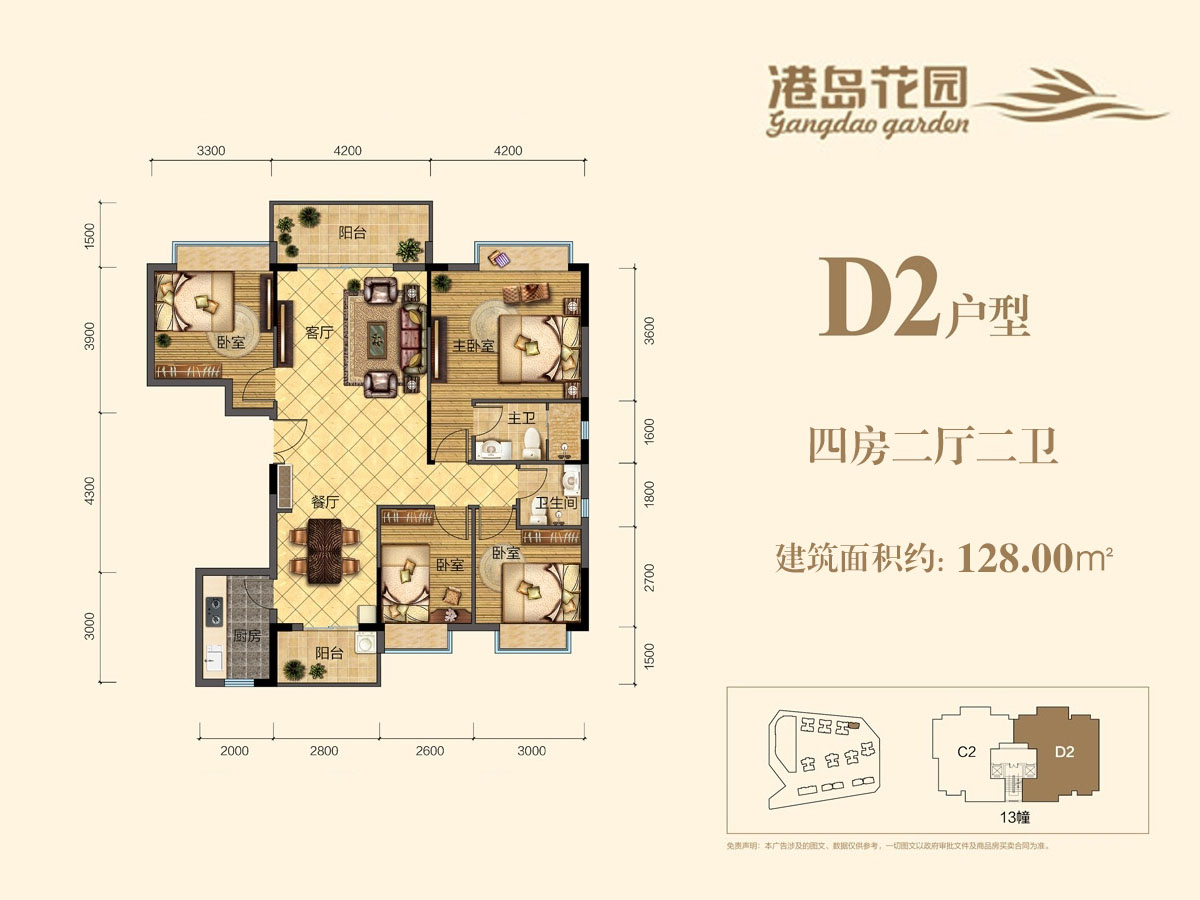 4室2厅2卫-D2户型建面约128㎡四房两厅两卫