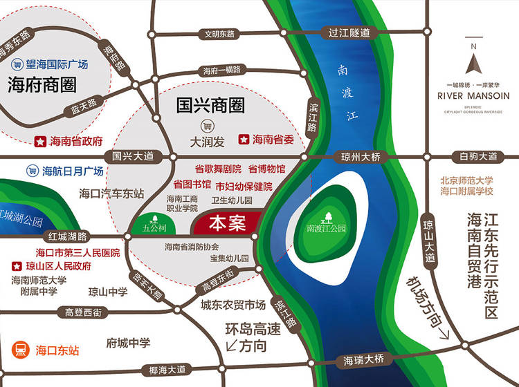 博大·锦绣滨江,南渡江岸一线江景华宅,位于红城湖路与滨江路交汇处,江东新区一江之隔,紧邻国兴商圈,繁华配套云集,是集智慧人居、金融商铺于一体的城市江岸社区。