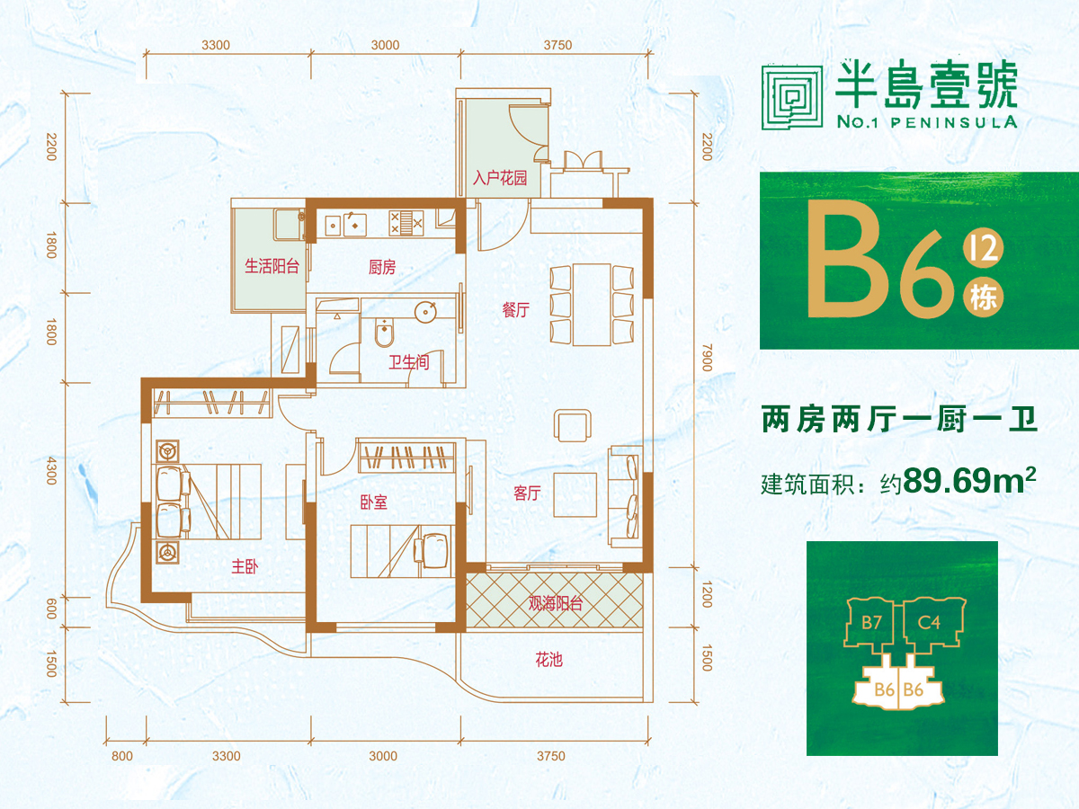 2室2厅1卫-B6户型 建面约89平 两房两厅