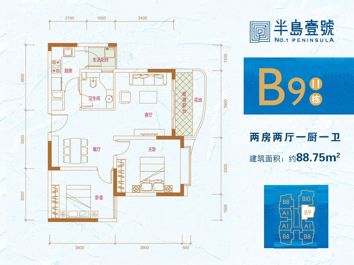 2室2厅1卫-B9户型 建面约89平 两房两厅
