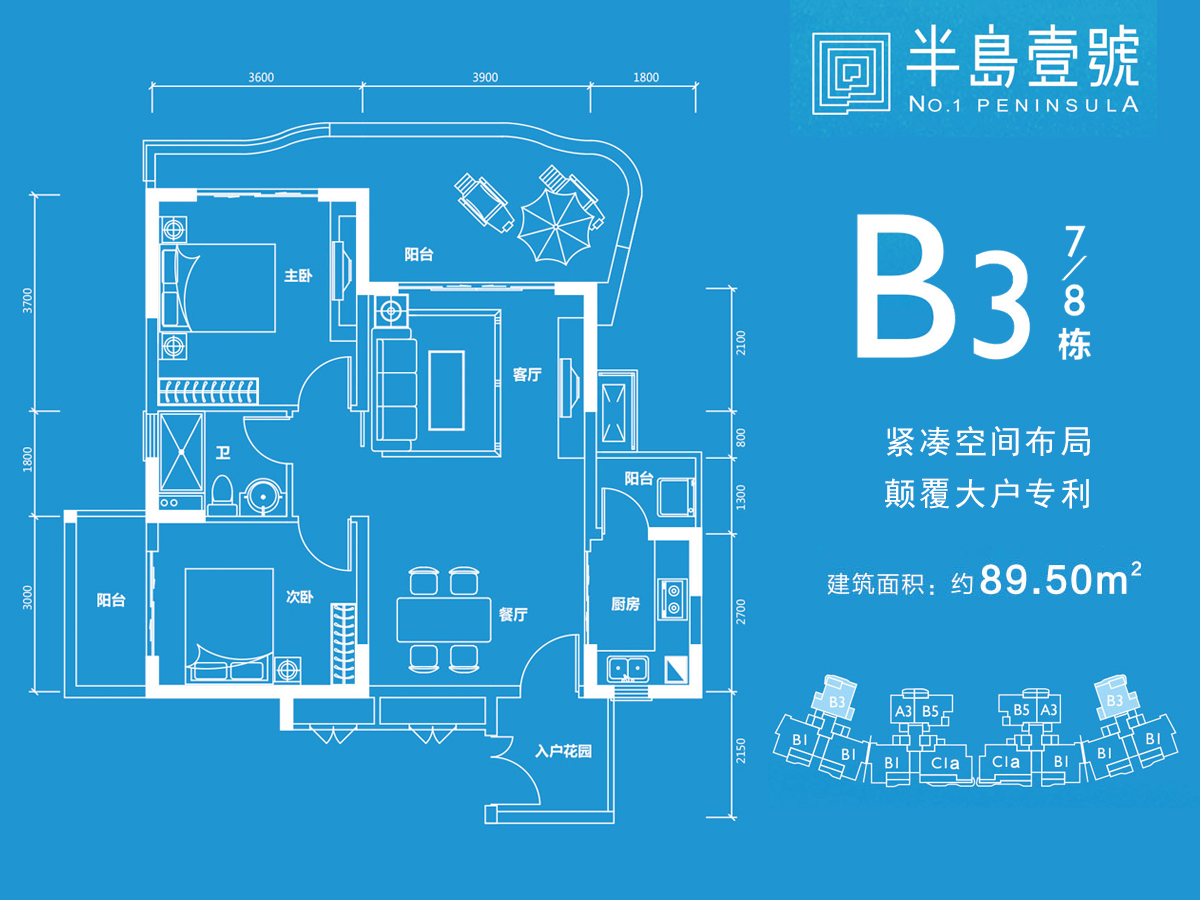 2室2厅1卫-B3户型 建面约89平 两房两厅