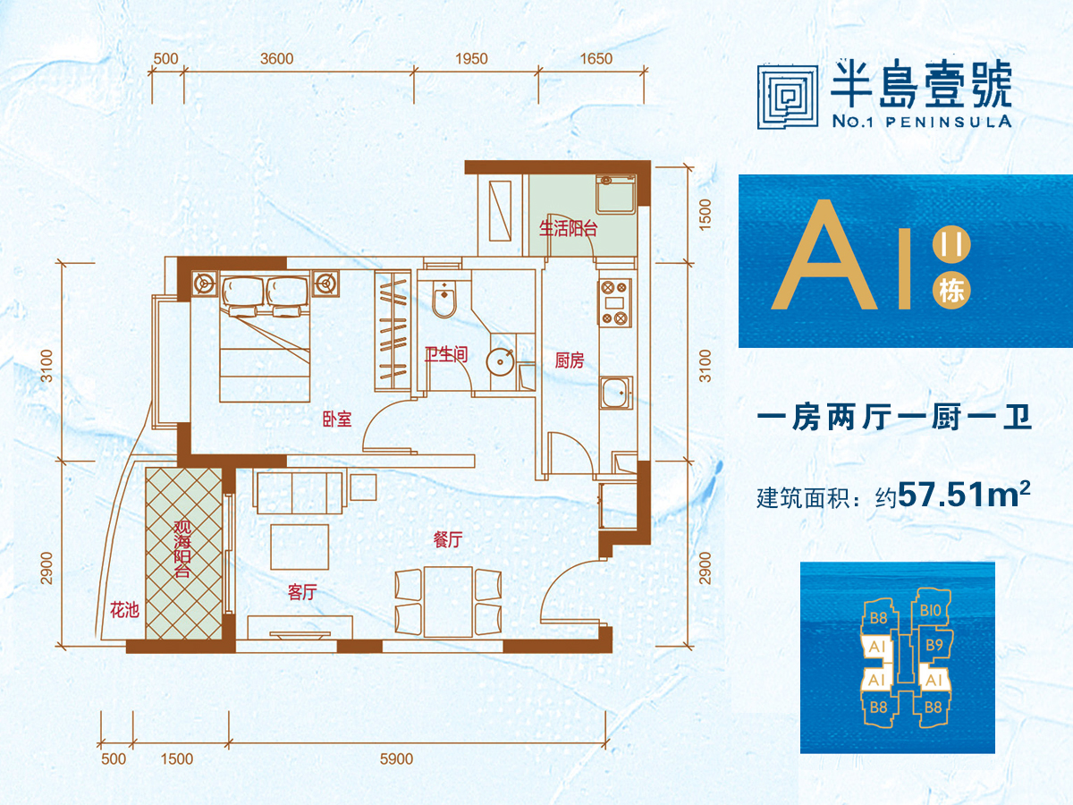 1室2厅1卫-A1户型 建面约57平 一房两厅