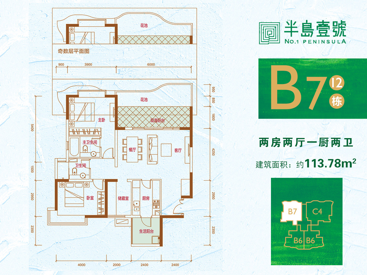 2室2厅2卫-B7户型 建面约113平 两房两厅