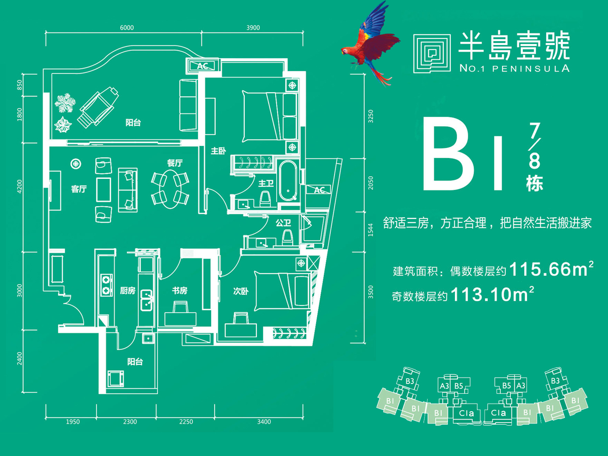 2室2厅2卫-B1户型 建面约115平 两房两厅