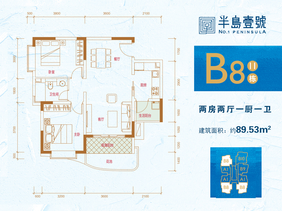 2室2厅1卫-B8户型 建面约89平 两房两厅