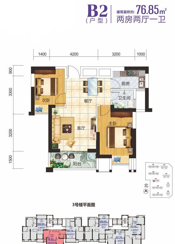 2室2厅1卫-3栋住宅B2户型图