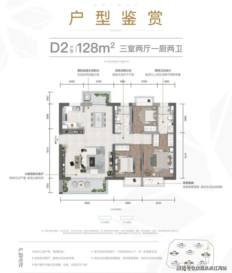 建面约128㎡三室两厅两卫:端头横厅户型,采光视野双优