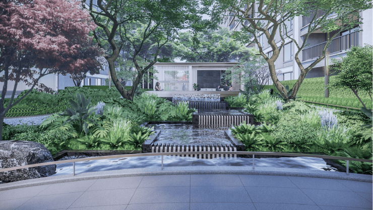 「九曲五境·山水栖居 」——归家动线升级、景观节点升级、互动空间升级。以一条核心归家轴、五大景观节点、全龄全域游乐场景,升级滇海社区景观体验。