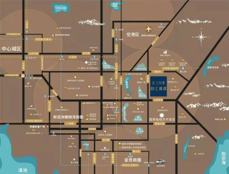 两横两纵的立体交通网络,横向的昆石高速、春漫大道向西直通昆明主城中心区。纵向渝昆高速、经开区主轴石龙路(呈黄线),周边还规划了地铁7号线(黄土坡站)及9号线(经开站);未来整个片区将形成高速公路、轻轨、城市快速干道为一体的立体交通网络,极速通达全城。