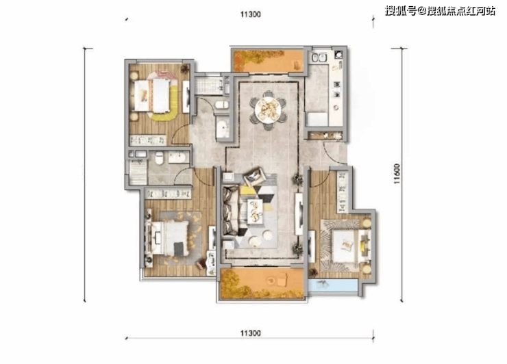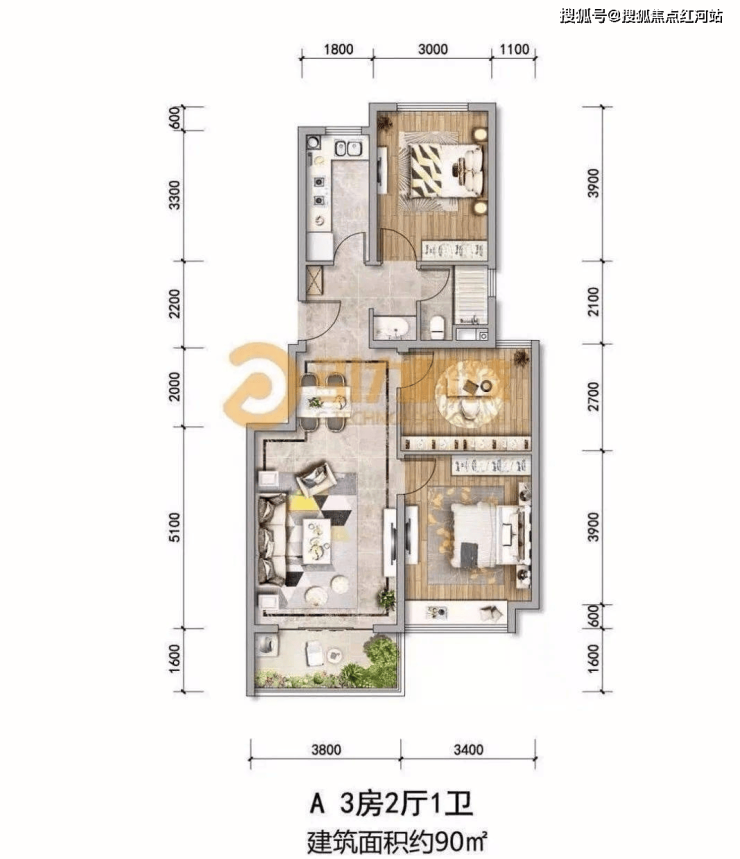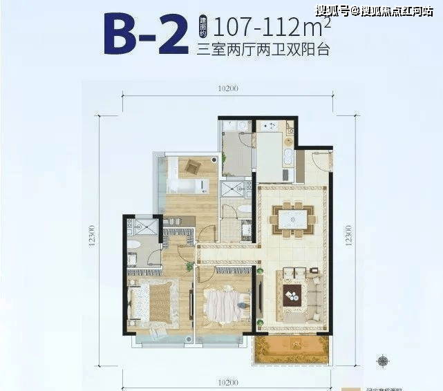 B2户型:约112㎡(3房2厅2卫)