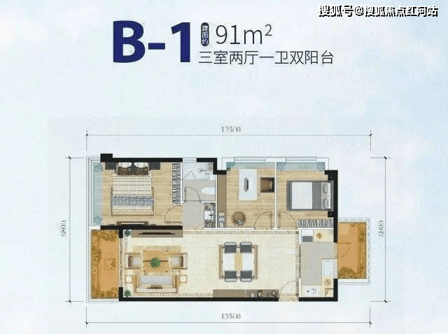 B1户型:约91㎡(3房2厅1卫)