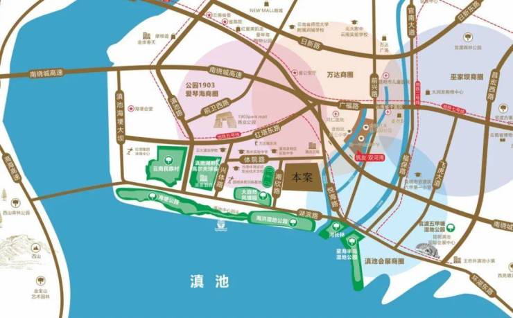 商业:公园1903爱琴海商圈、万达商圈、巫家坝商圈、滇池会展商圈环伺,无论衣食住行、购物、娱乐都能得到完美满足;