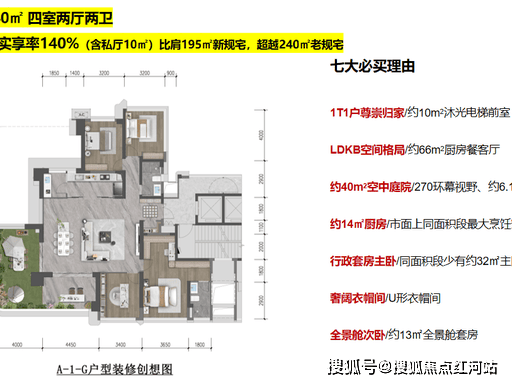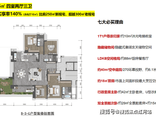 标配一梯一户独立电梯厅,LDKB 一体化客餐厅,全屋全明;约 40㎡集中式空中庭院(超 6 米挑高,奇偶层错位),入户有约 10㎡全明光厅;主卧带 U 型衣帽间与独立卫浴,适配三孩 / 三代同堂家庭。
