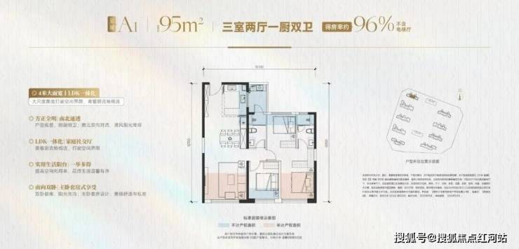 【星境】建面约95㎡,得房率约96%,高实用三室两厅双卫