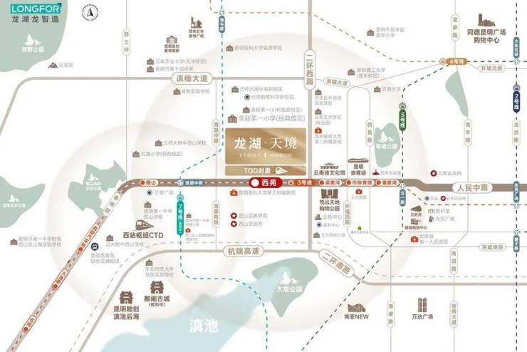 昆明龙湖天境是位于昆明市人民西路地铁3号线西苑站地铁口的高端住宅项目,项目占地面积129亩,规划建设15-31层的 2T2、2T6住宅,建面约89-235㎡的海派艺术住宅