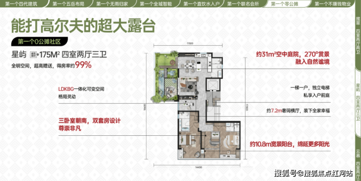 项目占地约37.8亩,建面约12.3万㎡,建筑密度约24.5%,规划470户住宅,主打建面约135-213㎡第四代空中大平院,70年产权;创新五岳布局、无雨归家连廊、华为全域智能、直饮水入户,打造0公摊社区,得房率最高超114%,户户空中花园,把院子搬上天空,革新一环人居体验。