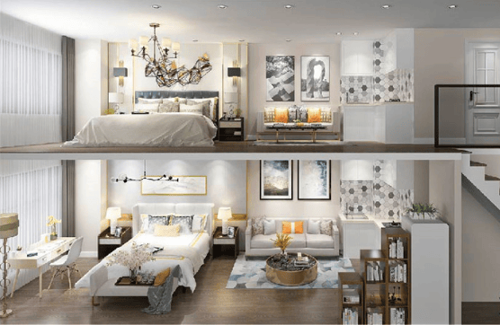 两层都具有卧室,起居室,卫生间,厨房,储藏等功能,更适合投资,双钥匙设计,一房两租,一套房子两份租金。