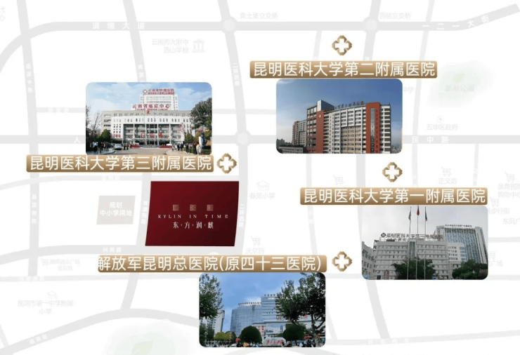 【医疗配套】:距离项目3-5公里范围内有大型优质医疗配套,如昆明医科大学第一、第二、第三附属医院,解放军昆明总医院(原四十三医院)等,保障家人的健康。