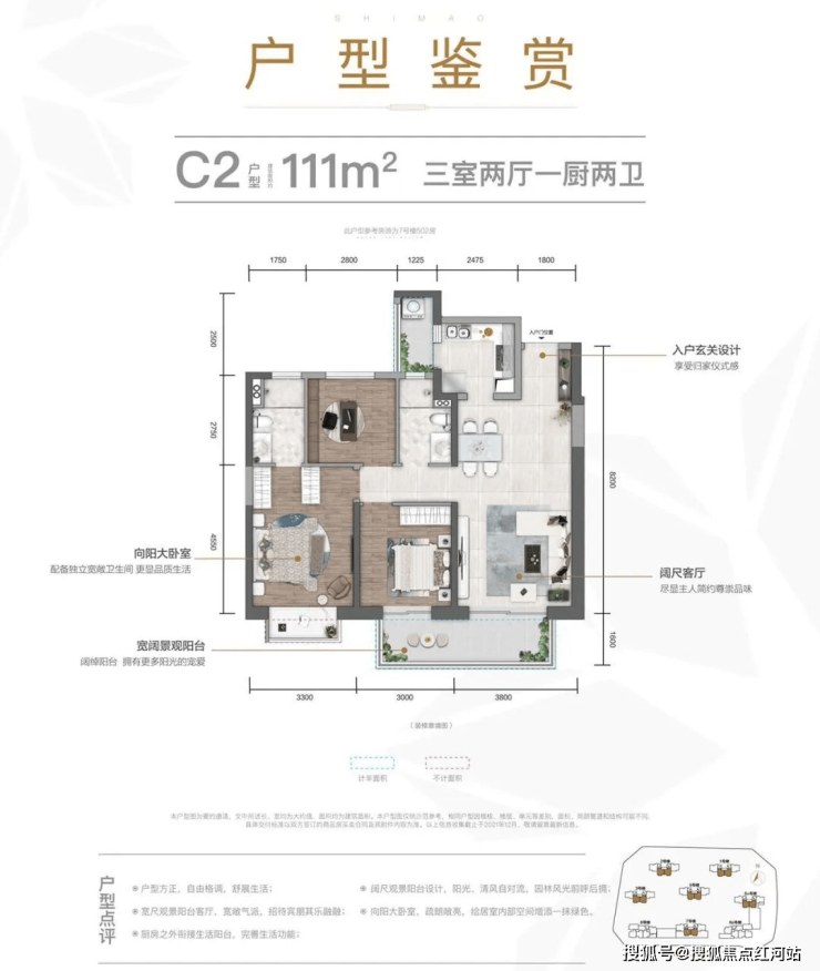 建面约111㎡三室两厅两卫(刚需爆款):整体格局周正,南向通透设计,采光通风效果拉满,告别阴暗潮湿。标准三室两厅两卫布局,空间规划零浪费,每一寸面积都物尽其用。动静分区合理,休憩区与活动区完全分隔,日常居家互不干扰。主卧配套独立卫浴,保障主人私密生活;双卫设计,完美化解早高峰洗漱拥堵难题,大幅提升居住幸福感。餐客一体连通观景阳台,纵向延展视觉空间,室内更显开阔敞亮,三口之家居住温馨舒适,年轻人首次置业无压力。