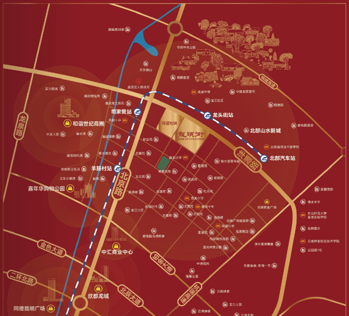 北市区核心,一步主路、两步地铁、三步客运站;北京路、沣源路一线临街,双主干道交点;地铁2号线龙头街站正对面,跨街天桥直达;距北部客运站800米,盘龙区政府500米;北市区绝对核心,黄金地段,地铁站赋能加持