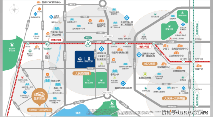 医疗上,3公里内云集云大医院、工人医院、肿瘤医院、43医院四大三甲医院,全周期健康守护;生态上,翠湖、大观楼、西山、草海湿地四大公园环伺,鲜氧宜居,尽享城芯自然静谧;教育上,3公里内汇聚云南师大附中、昆一等4所一级一等完中,高中就读选择多元。
