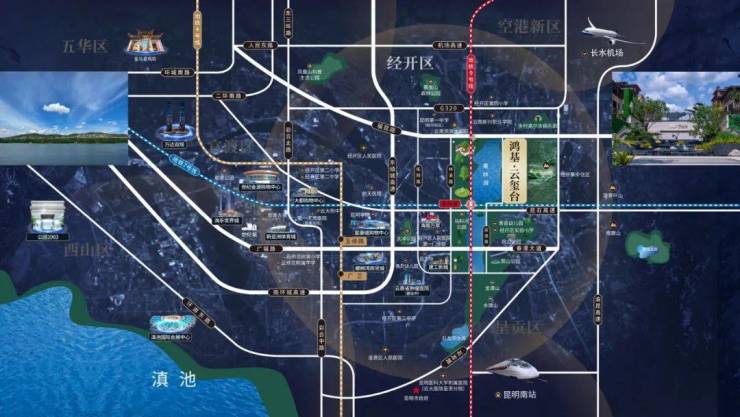 项目位于高铁经济圈范围内,距离高铁昆明南站约20分钟车程,距离昆明主城区、长水机场约30分钟车程。距离地铁9号线(规划中)的“果林湖站”1.5km、7 号线(规划中)“经开站”3km。