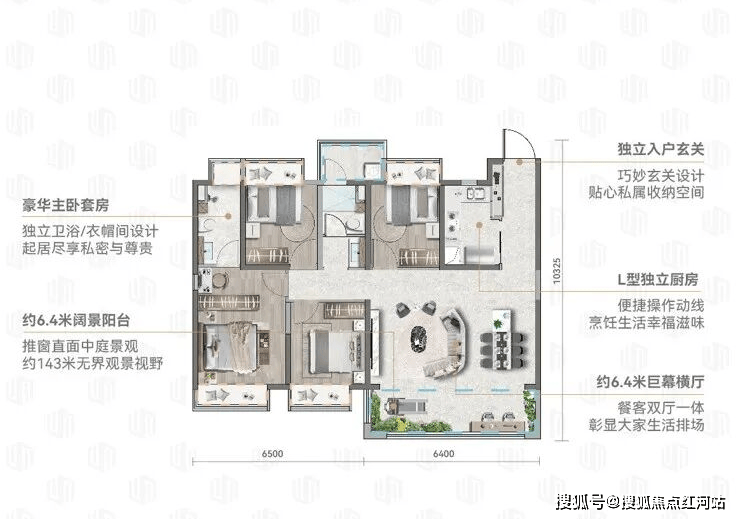 核心亮点:约 5.8m 宽横厅,可改四房;餐客分区,连接景观阳台;双主卧配置,精装交付标准高,适合追求尺度感的改善家庭。
