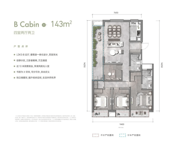 空间设计,视野扩展,形象轻盈*金镶玉立面:大面积水晶灰玻璃+铝板+铝线条的组合,增加几何流畅感,形成精致典雅立面*天幕镜面:昆明高层住宅首个0.28+的极致窗地比,光线和日照的极致享受