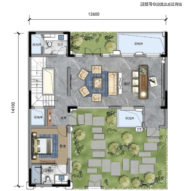 A1 建面约356㎡,露台面积约46㎡,可拓展最大面积约535㎡