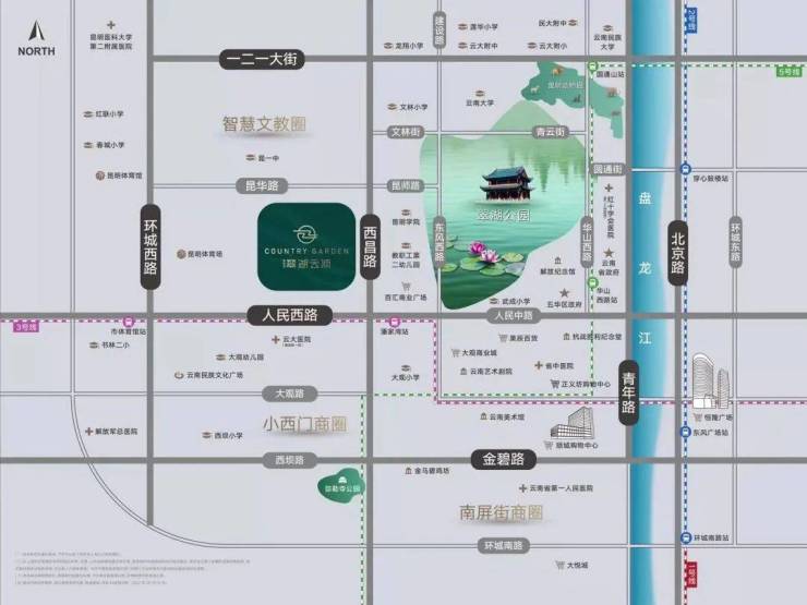 教育配套:北侧紧靠昆明市第一中学,周边一公里范围内,有大观小学、先锋小学、春城小学等优质的教育资源。昆明理工大学(莲华校区)、云南大学、昆明学院(昆师路校区)等大学也在项目附近。