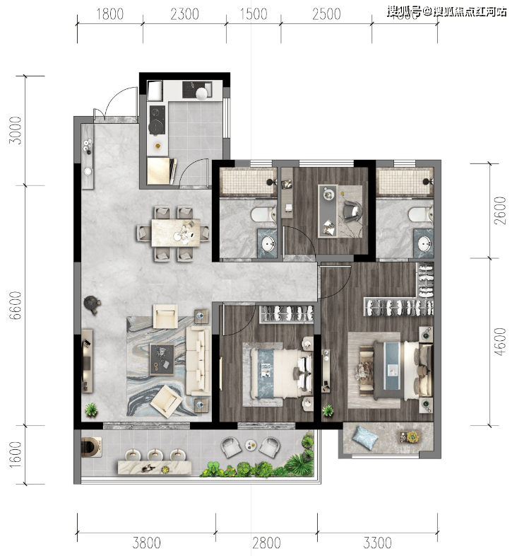 D户型:建面约107㎡,三室两厅两卫