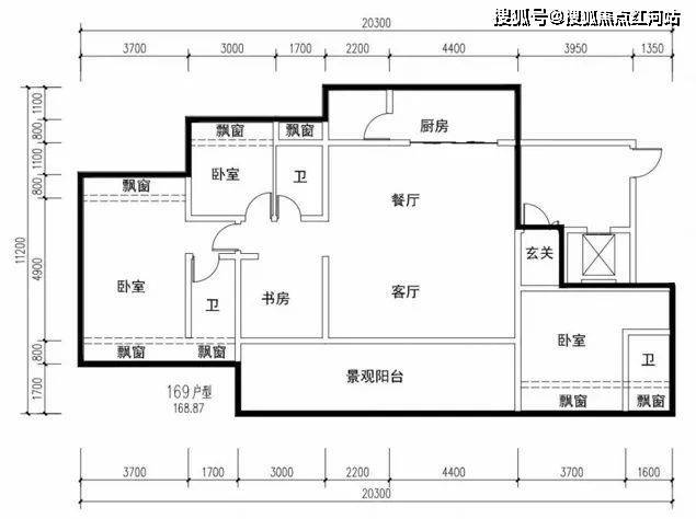 面积169㎡:4室2厅3卫2阳台,电梯入户、全飘窗;
