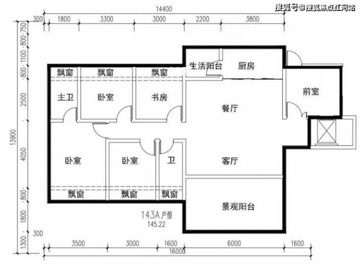 面积143㎡:4室2厅2卫2阳台,电梯入户、高得房率(大阳台/全飘窗)
