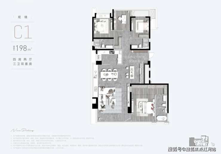 C1观境(建面约198㎡):四房两厅三卫双套房,北向揽景阳台,阔景视野,尽纳阳光清风;南向约11.3m全景采光面,270°环幕视野;奢雅主卧,臻配独立衣帽间、卫生间、浴缸,次卧配置独立卫浴、衣柜区,尽显尊崇。